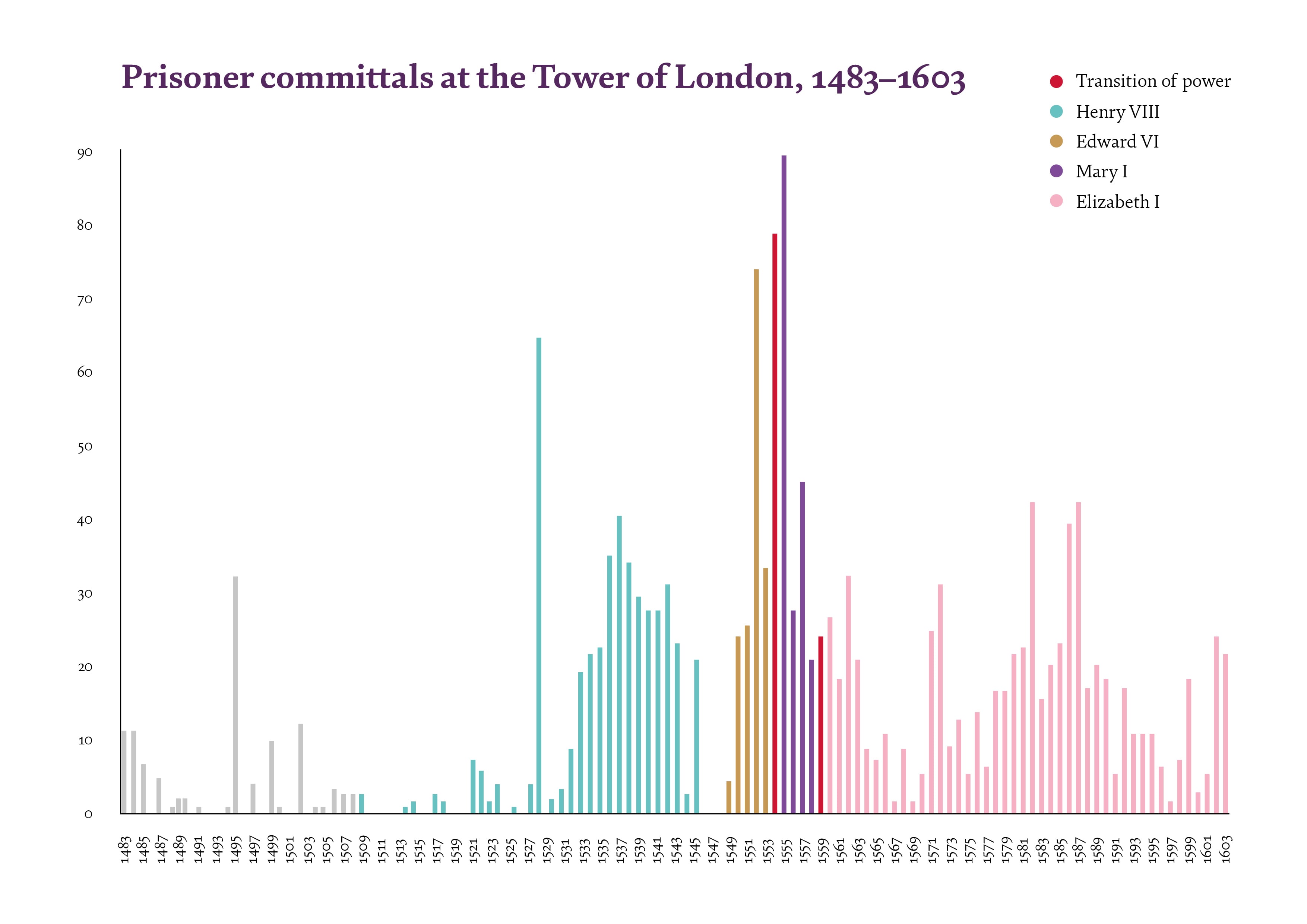 This graph reveals how many prisoners were held at the Tower of London during the reigns of Henry VIII, Edward VI, Mary I and Elizabeth I.
